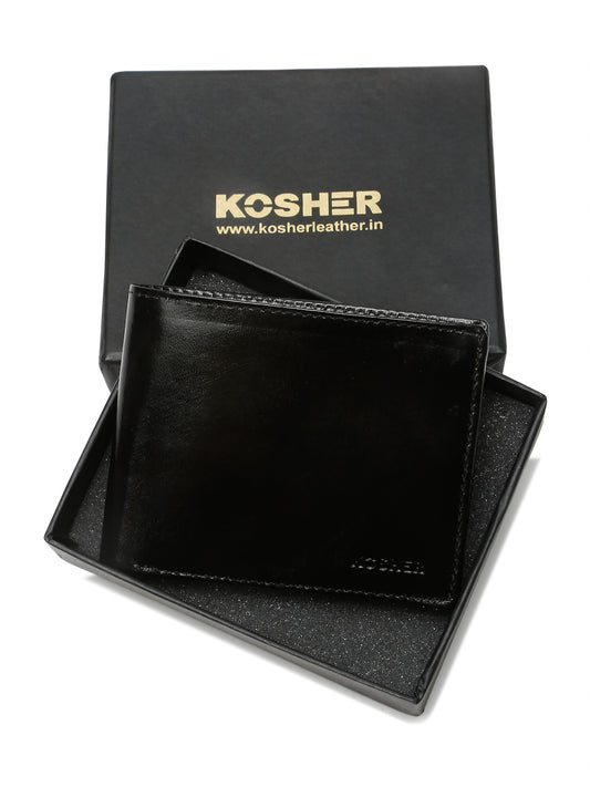 KOSHER Black Color Men's Classic Bi-Fold Leather Wallet With Flap ID Card Window And Multiple Card Slots