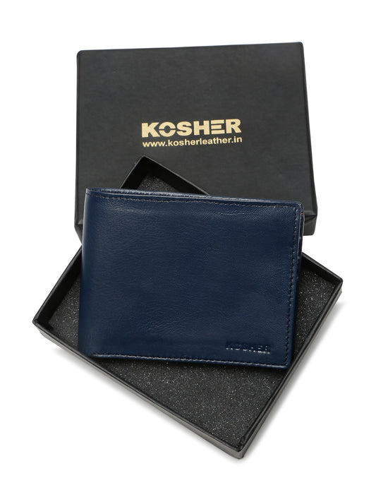 KOSHER Blue Color Men's Genuine Leather Bi-Fold Wallet Slim Design With Card Slots & ID Window